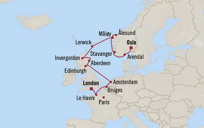Entdecken Sie die Schönheit Norwegens und die rauen Landschaften der britischen Inseln. Streicheln Sie die liebenswerten Ponys der Shetlandinseln, schlendern Sie durch Oslos kunstvoll geschnitzte Stabkirche Gol und kreuzen Sie durch den atemberaubenden Sognefjord, den längsten Fjord Skandinaviens.