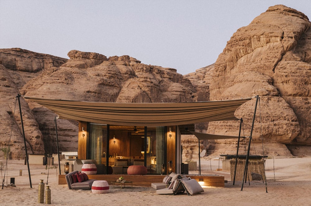 Exklusive Experience: Drei der 16 Resorts sind bereits eröffnet. Das von der Kultur der nabatäischen Händler inspirierte Six Senses Southern Dunes bietet erstklassige Ausblicke auf Wüstendünen und das imposante Hijaz-Gebirge.