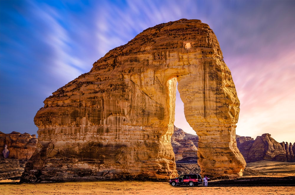 Der markant geformte Elephant Rock aus rotem Sandstein zählt zu den Wahrzeichen der Region AI-Ula – er befindet sich inmitten einer spektakulären Wüstenszenerie.